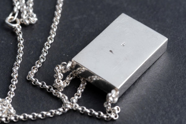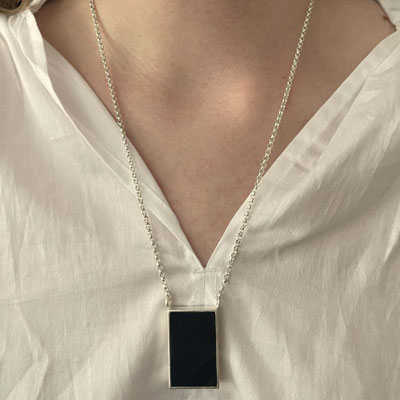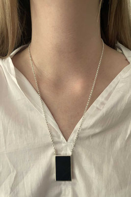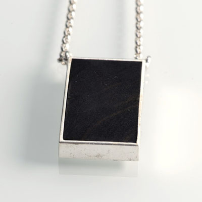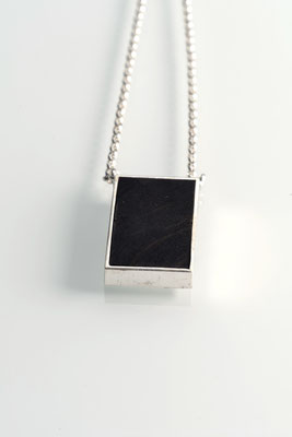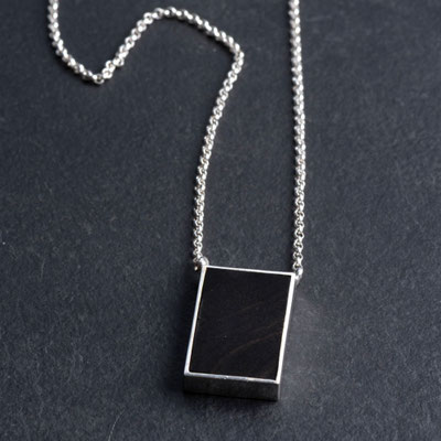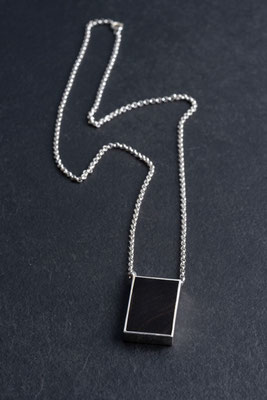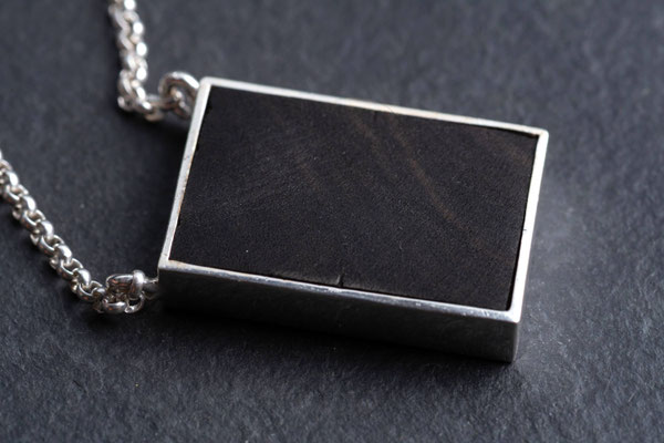 wunderschönes Collier mit einer Einlage aus edlem Palisanderholz. Die 54 cm lange Erbskette (Rolo Chain) trägt einen rechteckigen Anhänger (3 × 2 cm, 6 mm stark), in dem das dunkelbraune bis schwarze, fein gemaserte Holz eingefasst ist.