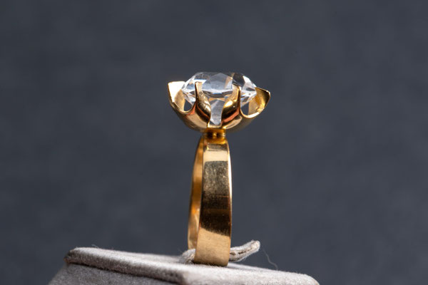 Der klare Stein ist facettiert im klassischen Rundschliff - ähnlich Brillantschliff, aber etwas gröber gefasst, typisch für Vintage-Stücke