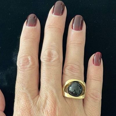 Dieser auffällige Vintage-Ring besticht durch sein klares, skulpturales Design. Im Zentrum sitzt eine glänzend polierte Onyx-Halbkugel, die von einer offenen Umrahmung gehalten wird.