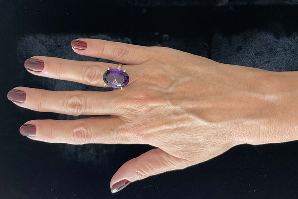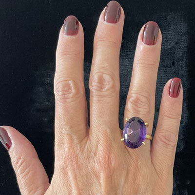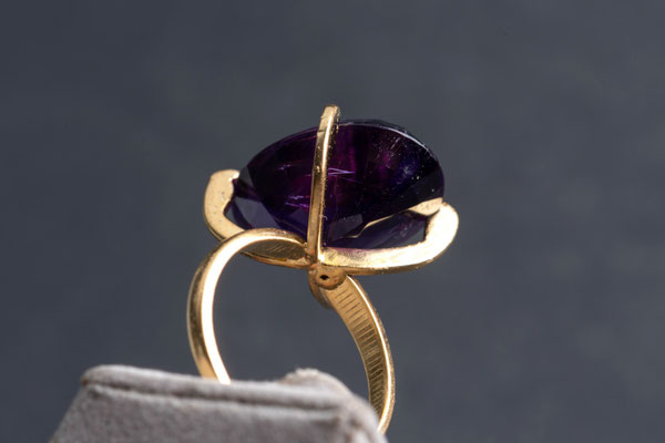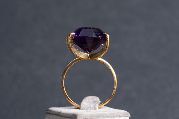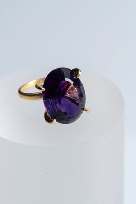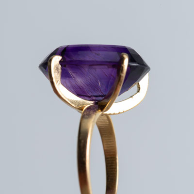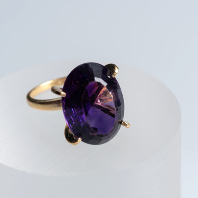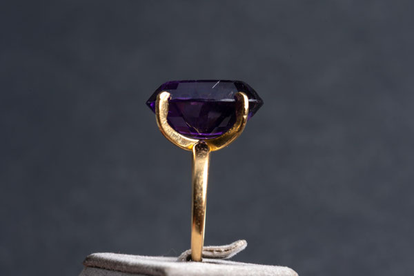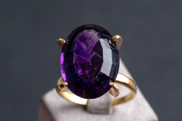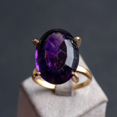 Der intensiv violette Amethyst misst ca. 20 × 15 mm bei fast 10 mm Höhe.