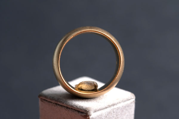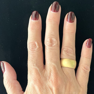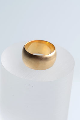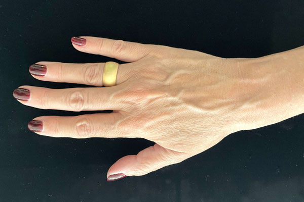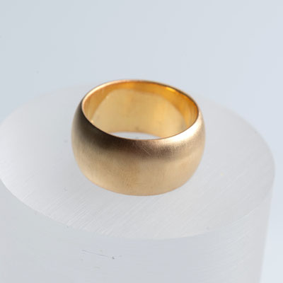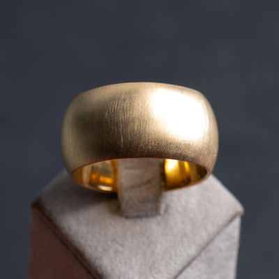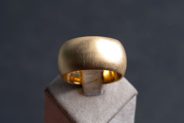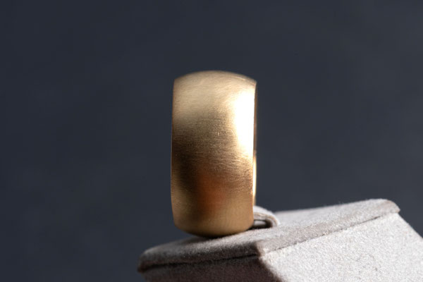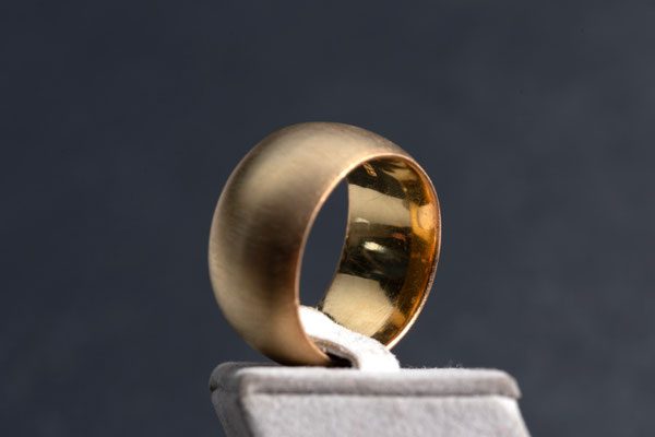 Mit seiner soliden Wandstärke von ca. 2,5 mm und einer Breite von 1,1 cm liegt der Ring angenehm schwer am Finger. Durch die massive Bauweise fällt er aber etwas kleiner aus – gemessene Größe 59 entspricht einer Tragegröße von etwa 57